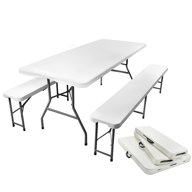 Dette sammenleggbare hagebordet med to matchende benker er en perfekt løsning for grillfester, piknik, camping eller andre utendørsarrangementer. Bordet har en solid pulverlakkert stålramme og en slitesterk bordplate i plast som tåler både regn, sol og høy belastning.