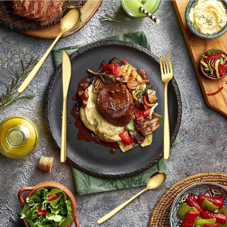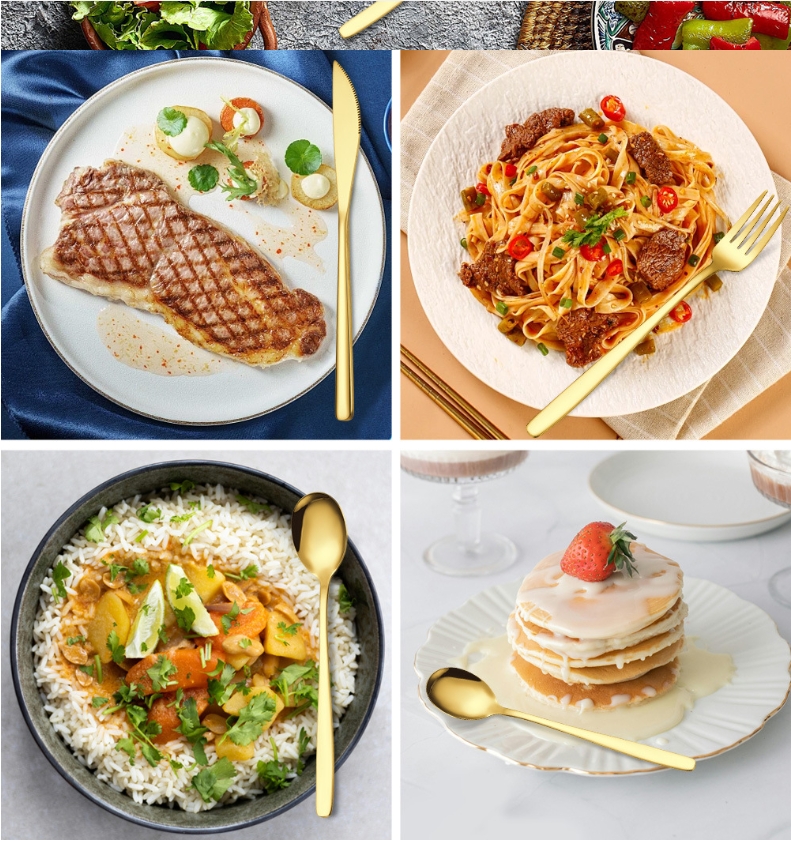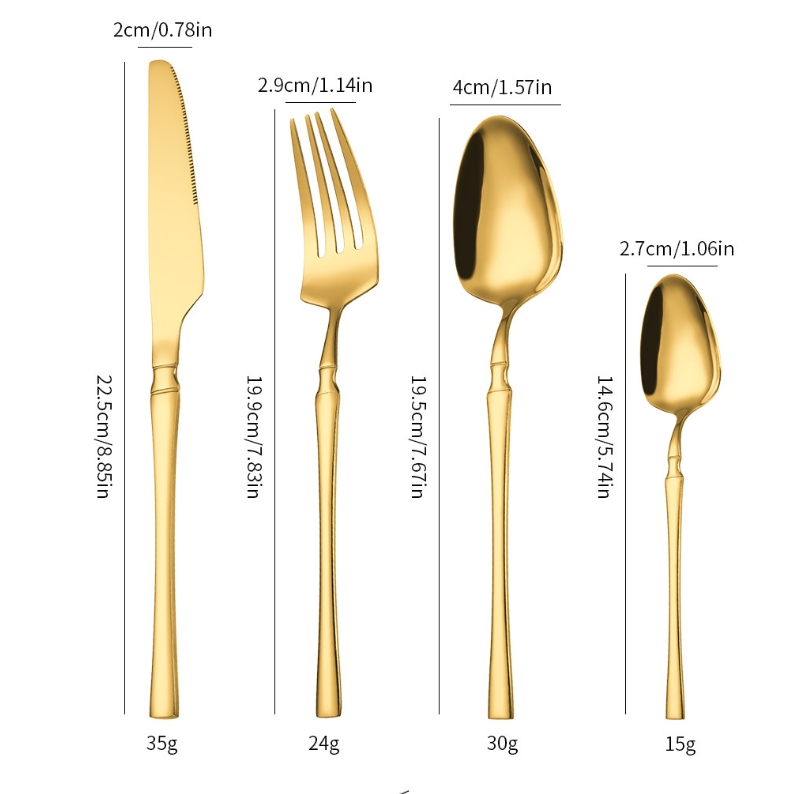 Oppgrader kjøkkenet eller serveringen din med dette elegante 24-delte bestikksettet i rustfritt stål, perfekt både til hverdags og til fest. Settet har et tidløst design som passer i de fleste kjøkken og kombineres enkelt med eksisterende servise. Materialet er slitesterkt, og alle delene tåler oppvaskmaskin. Velg mellom klassisk sølv eller stilfullt gull for et personlig preg.