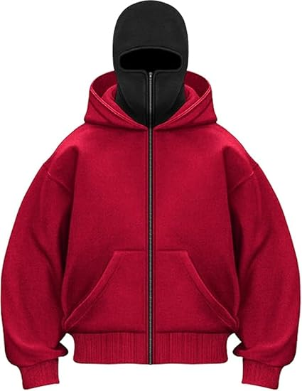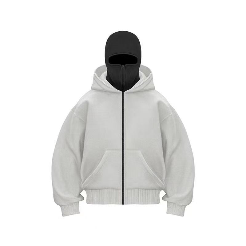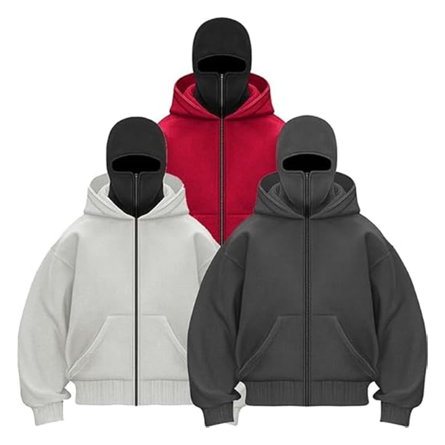 Beskytt deg mot kulde og vind med denne dobbeltlags hettegenseren med innebygd balaclava. Den er laget av en myk bomullsblanding som er både varm og pustende. Perfekt for kalde dager, trening, motorsykkelkjøring eller hverdagsbruk. Stilig design med glidelås, kengurulommer og hette.
