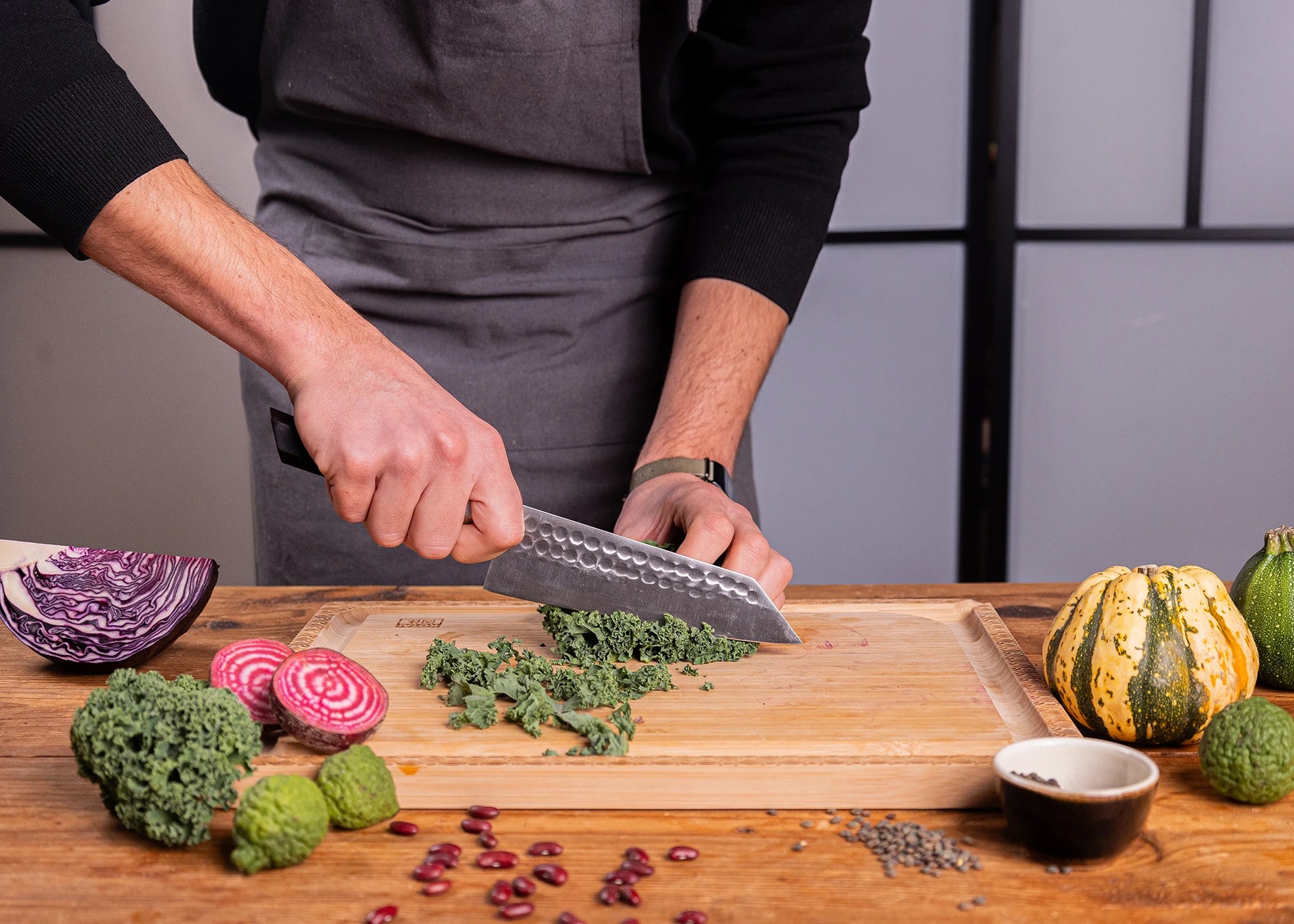Bunka Santoku i damaskusstål er den mer tradisjonelle ekvivalenten til den klassiske Santoku-kniven – en allsidig kniv som er ideell for å hakke grønnsaker og frukt, skjære kjøtt og tilberede fisk (men ikke bein eller frossenmat).