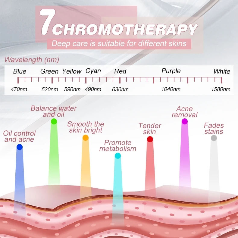 - Kraftig 7-farge LED-teknologi gir skreddersydde løsninger for akne, rynker og hudtone