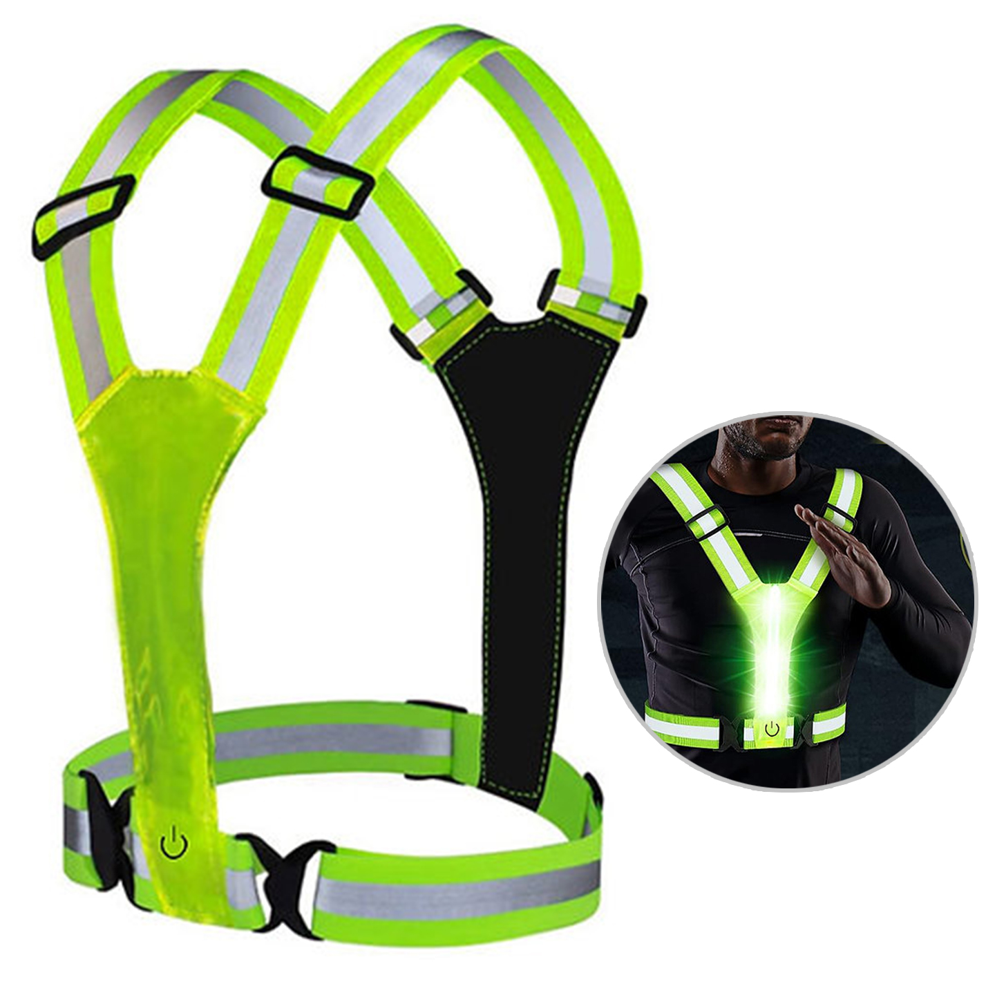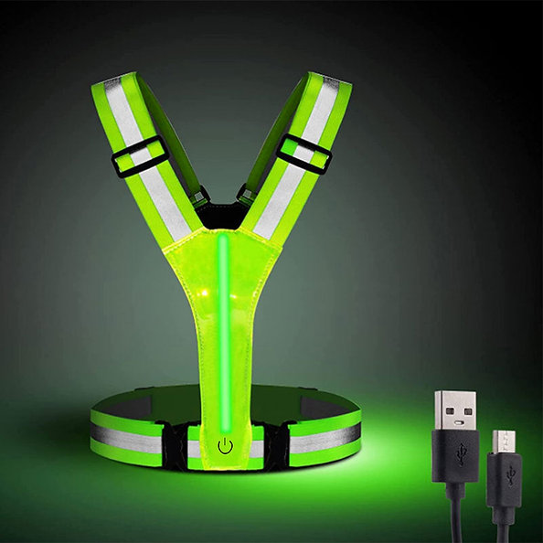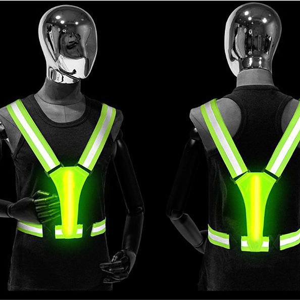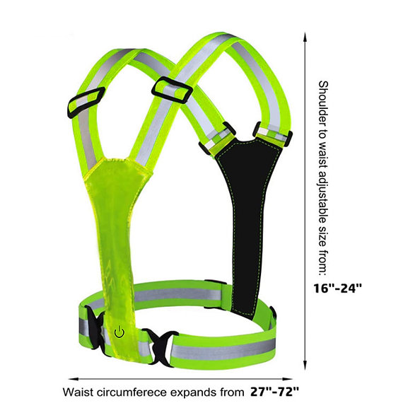 Justerbar løpevest med oppladbart LED-lys. 360 graders reflekterende bånd holder deg trygg i alle værforhold (regn, tåke, mørke) dag og natt.